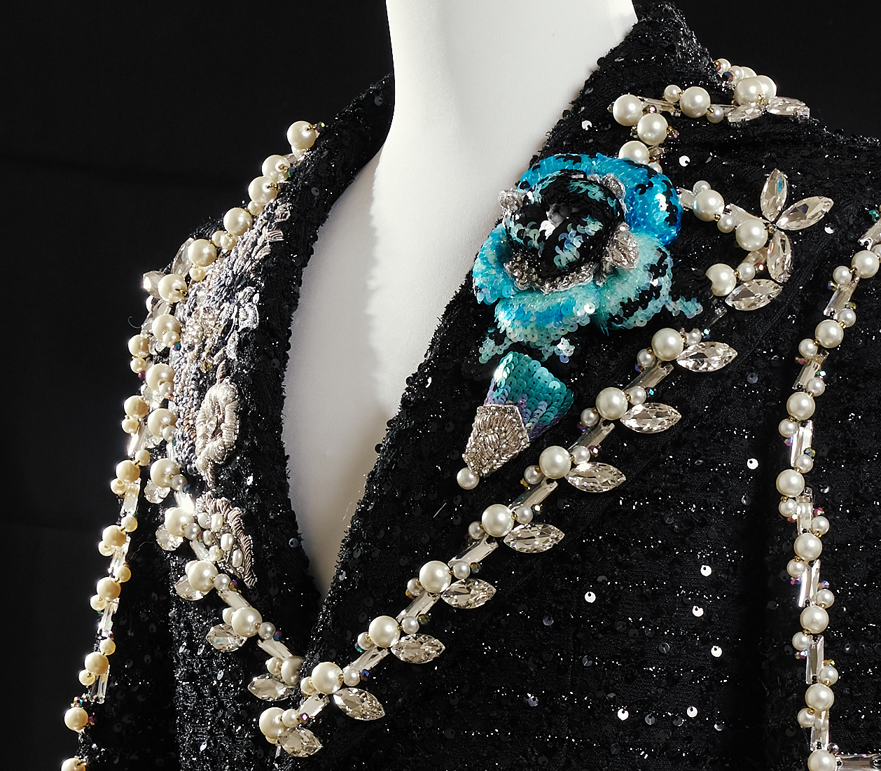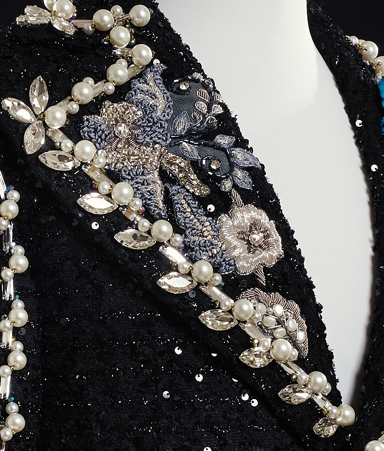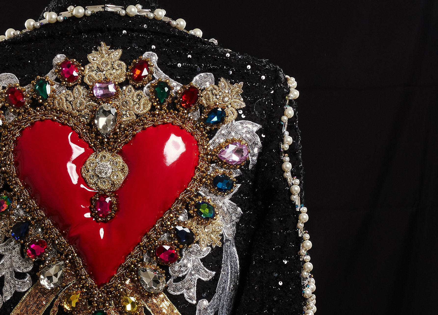 Every element is meticulously hand-finished, from the pearl-trimmed seams to the sculptural heart emblem. Precision embroidery and gemstone placement create depth, symbolism, and luminosity, elevating the jacket into a wearable relic—where couture meets devotion.