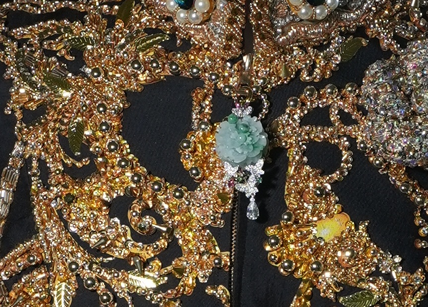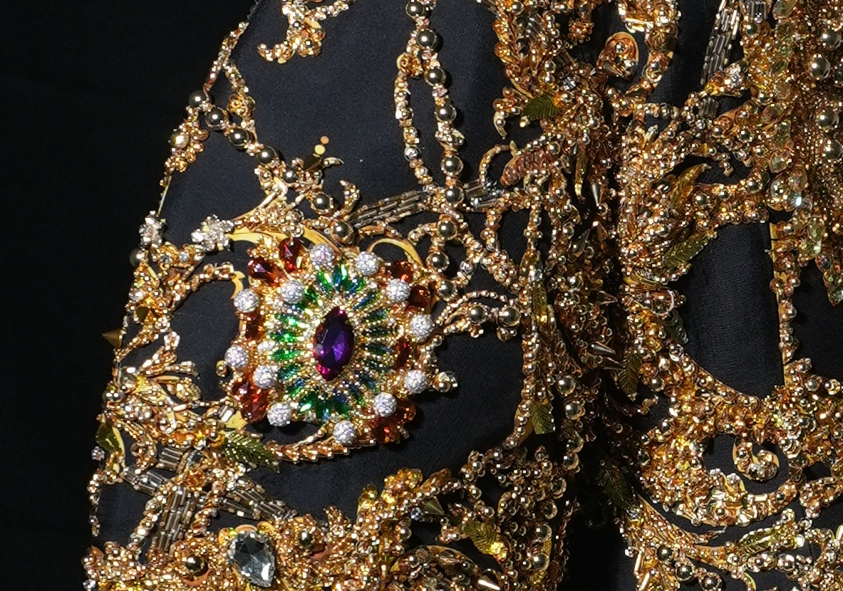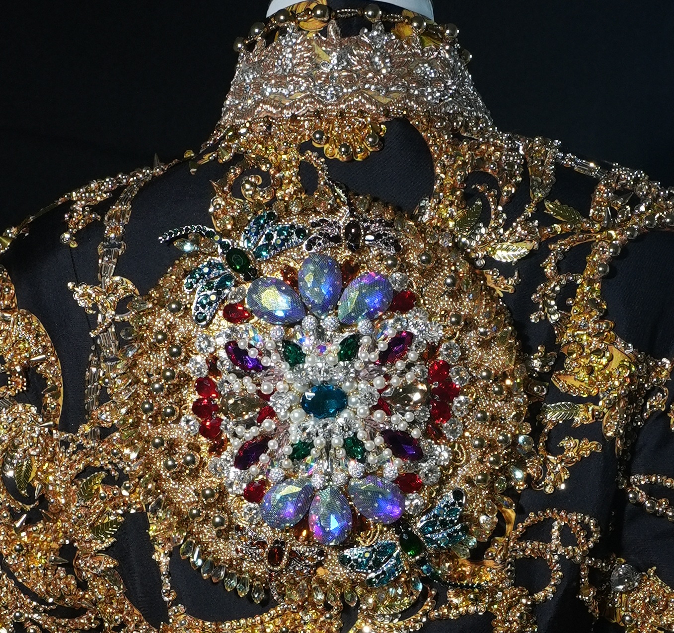 The jacket features a foundation of deep onyx fabric printed with lavish gold scrollwork reminiscent of antique ceremonial vestments. Once fully embellished with pearls, jeweled cabochons, and radiant crystals, each motif becomes a glowing emblem, echoing the sacred geometry of gilded armor. The dramatic silhouette amplifies presence, while the interplay of black and gold suggests both divine mystery and imperial luxury.