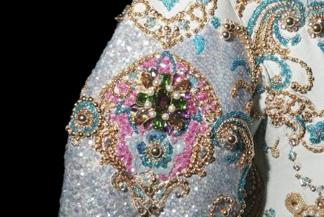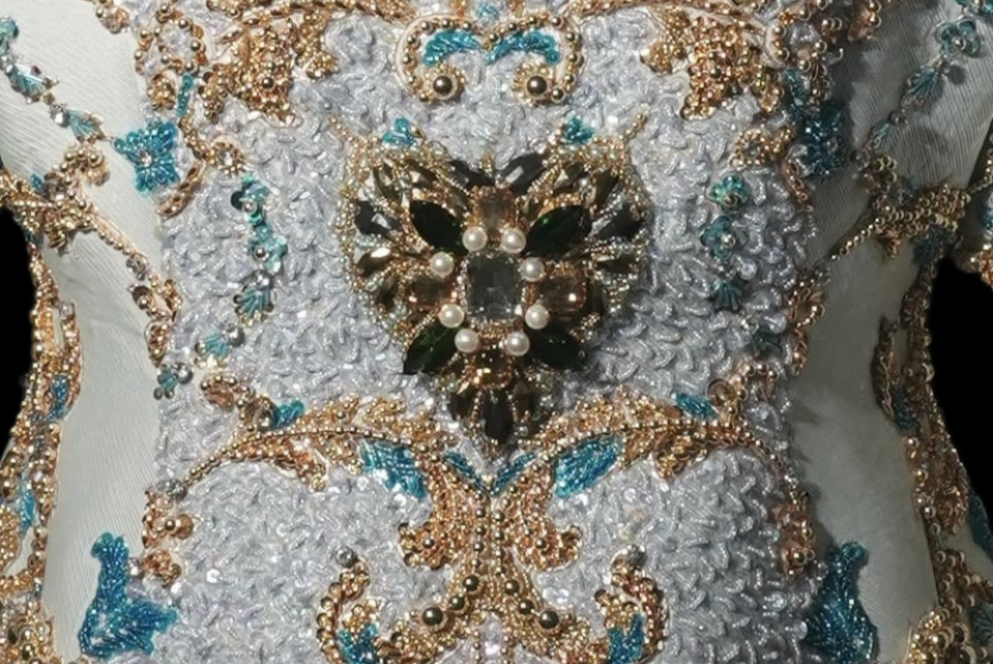 vory satin is drenched in gold filigree, aquamarine crystals, and lustrous pearls. Baroque motifs sweep across the form, while jeweled medallions in sapphire, rose, and turquoise evoke sacred mosaics and royal ornamentation.