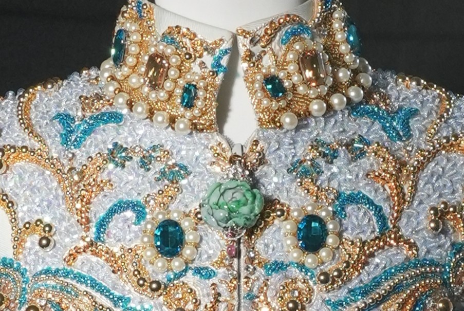 Every bead, pearl, and crystal is hand-set to build dimension and brilliance. Sculpted sleeves and an encrusted collar give the piece its commanding presence, creating a wearable relic of luxury — where protection becomes art.
