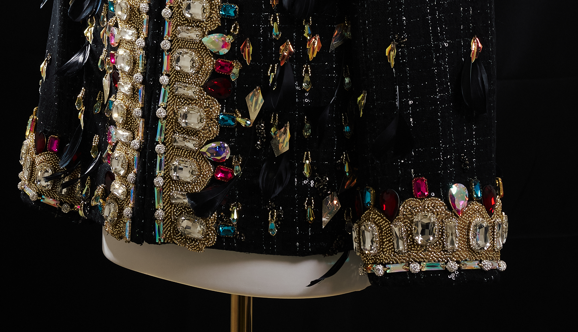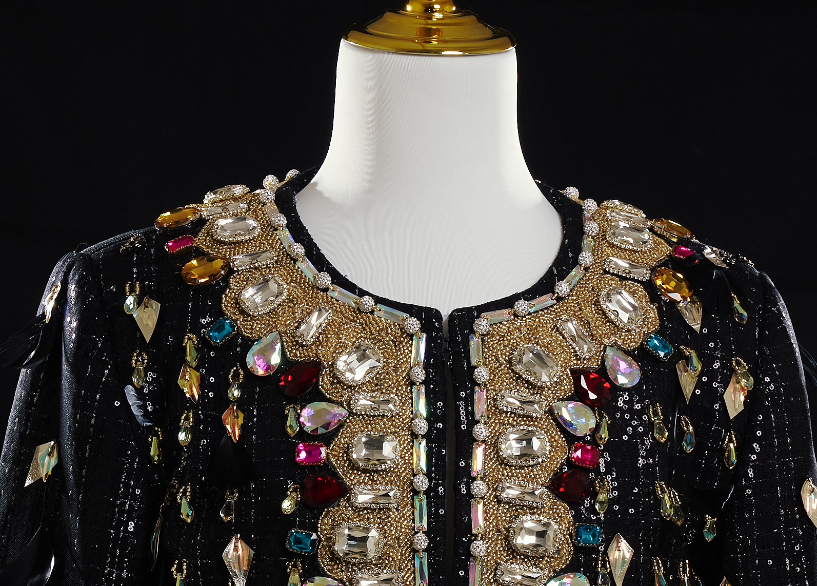 Multicolored crystals, metallic beads, and reflective elements are individually hand-applied, forming a quiet yet rhythmic surface.