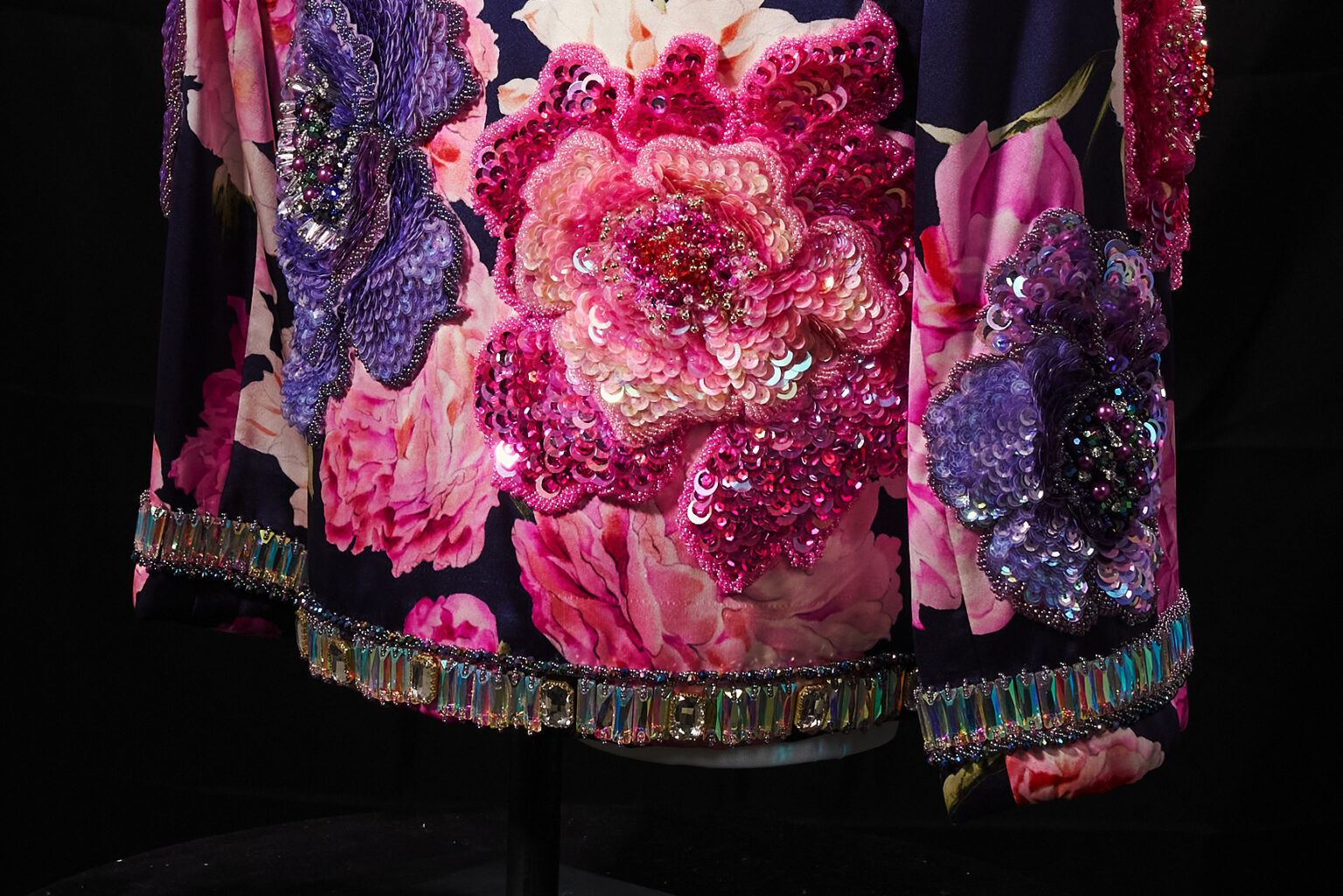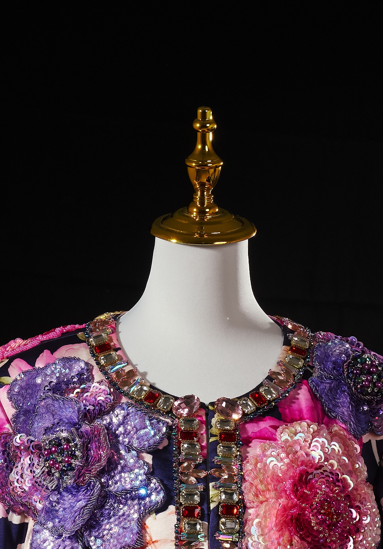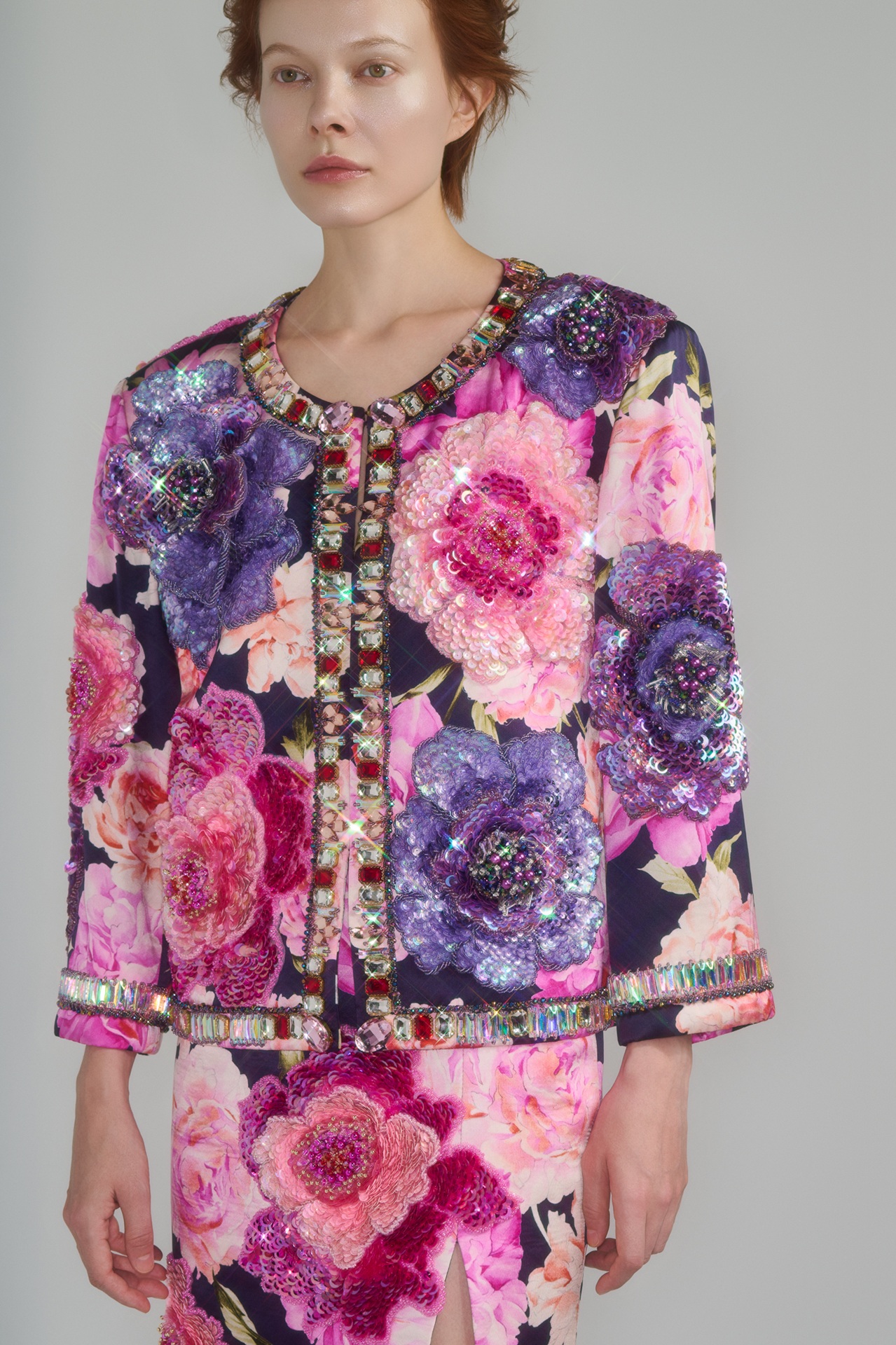 The jacket features a deep floral base adorned with large hand-embroidered blooms in shades of magenta, lilac, and blush. Sequins, gemstones, and crystals bring each petal to life, reflecting light with every movement.