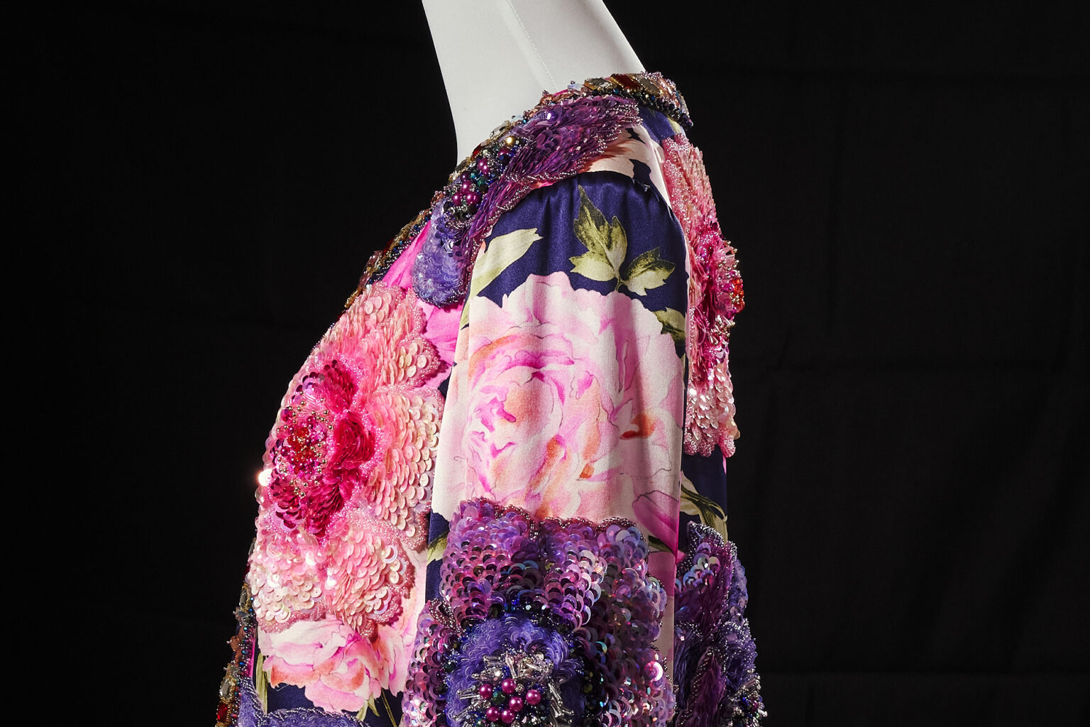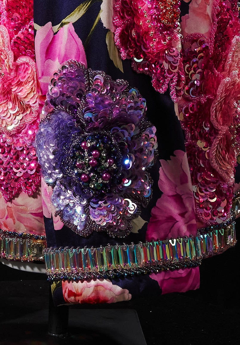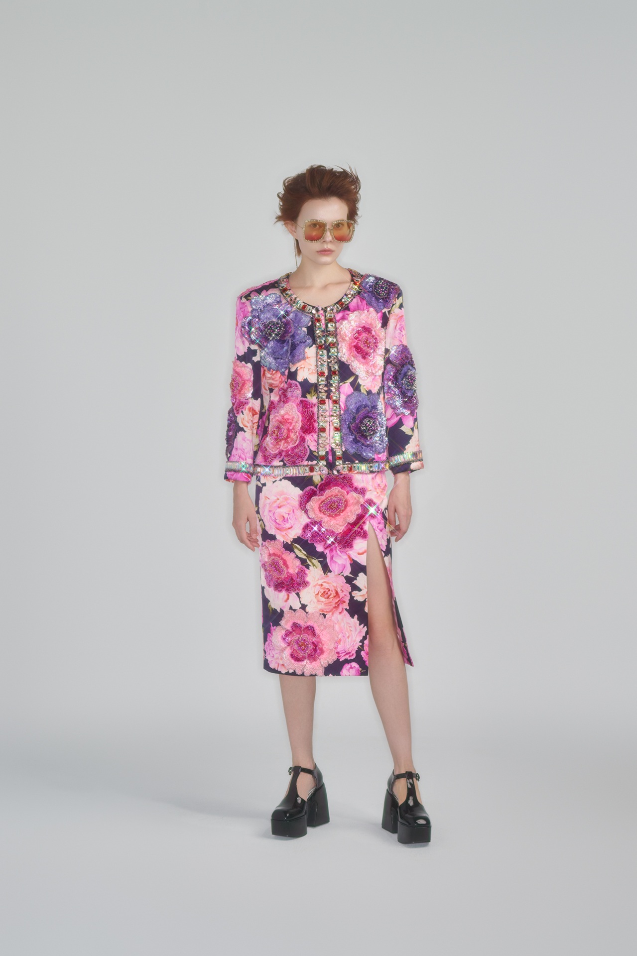 The jacket features a deep floral base adorned with large hand-embroidered blooms in shades of magenta, lilac, and blush. Sequins, gemstones, and crystals bring each petal to life, reflecting light with every movement.