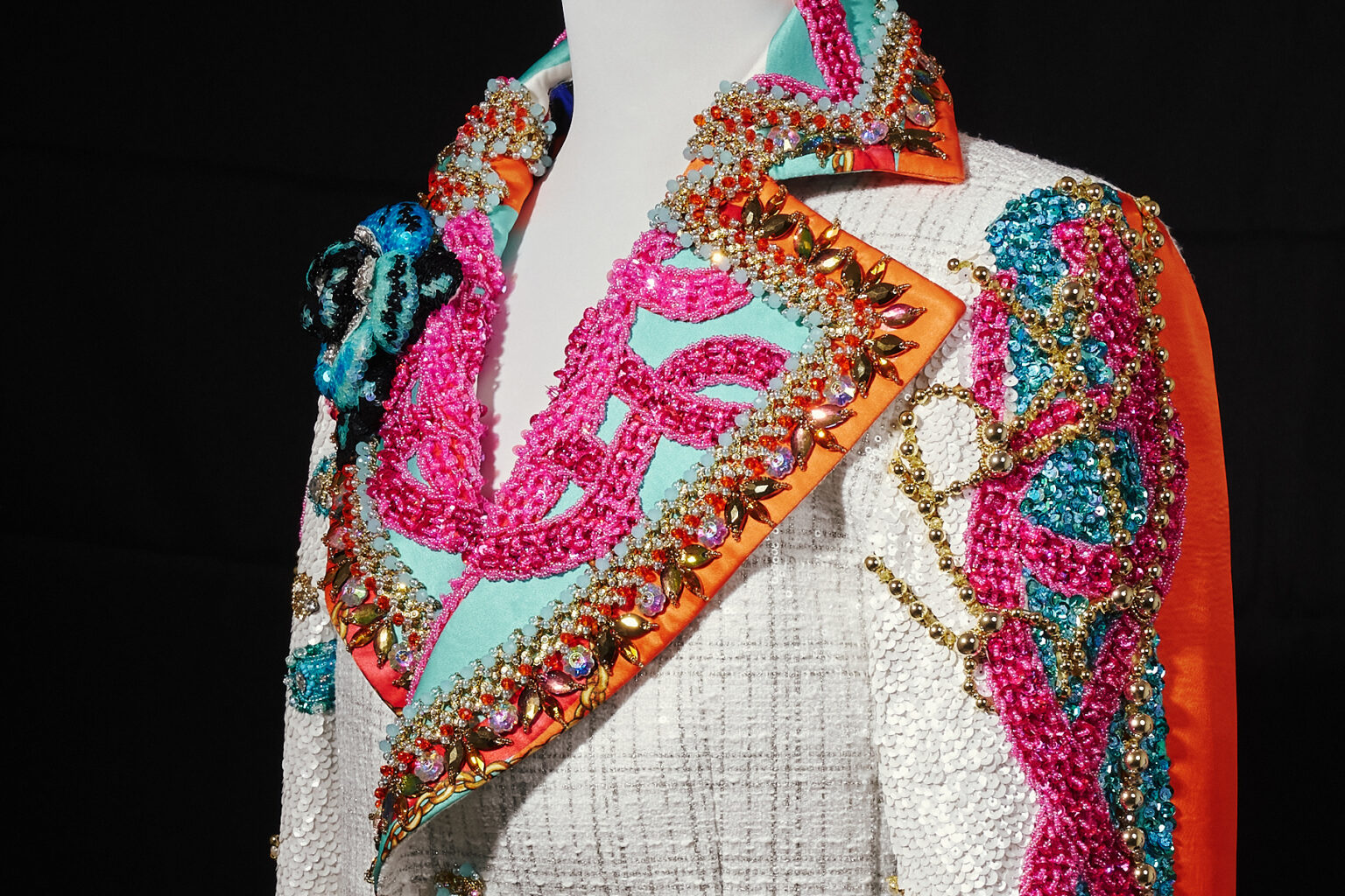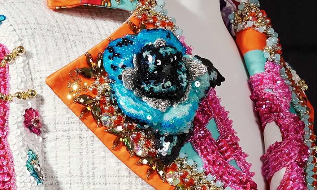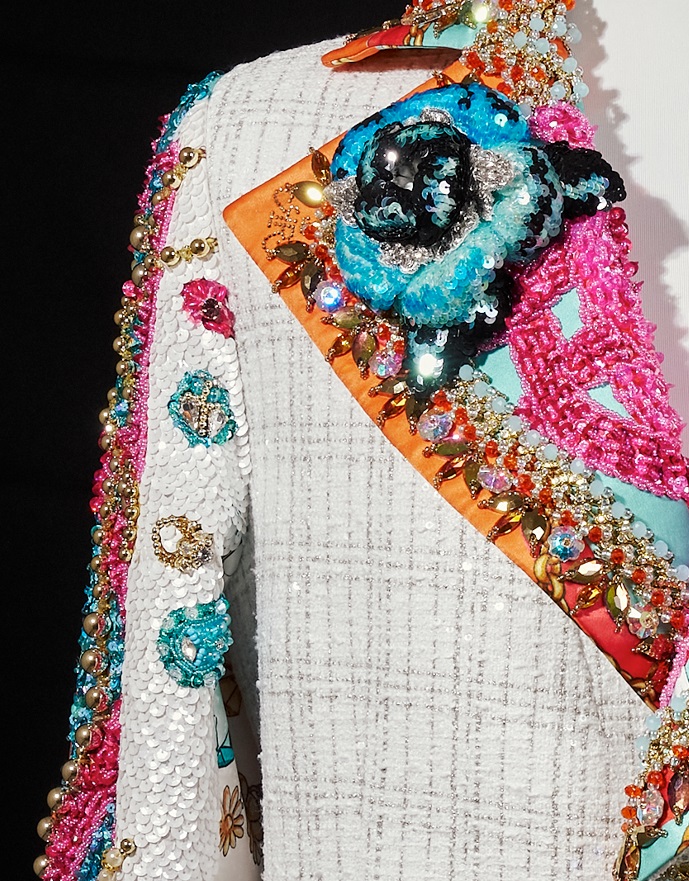 The jacket features a luxurious white tweed base symbolizing purity and order, contrasted by vivid orange, fuchsia, and turquoise accents that mimic the brilliance of fireworks. Hand-sewn jewels, pearls, and metallic threads create an ornate composition that glimmers with every movement.