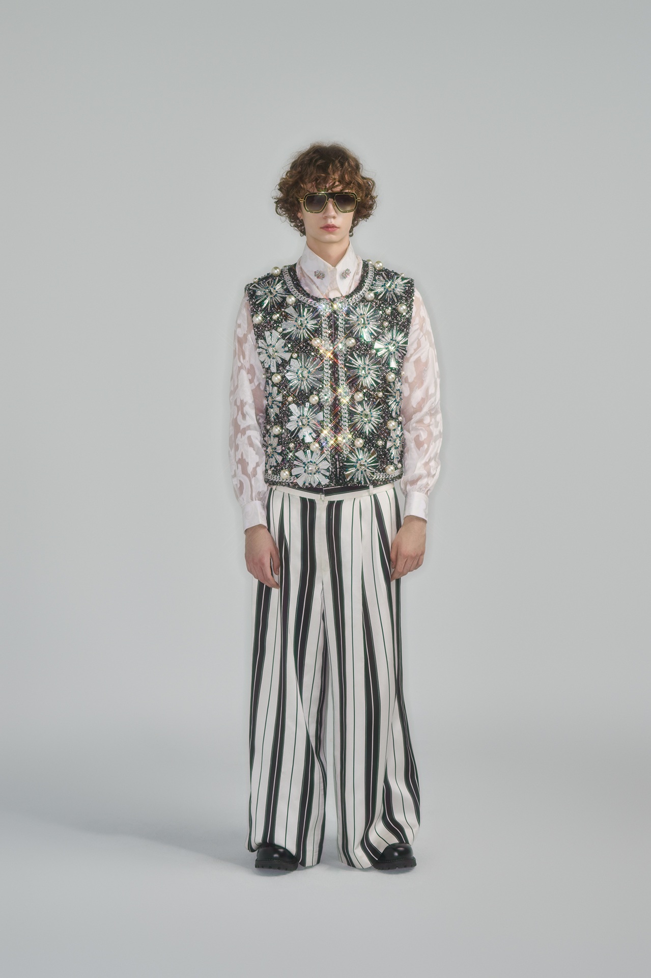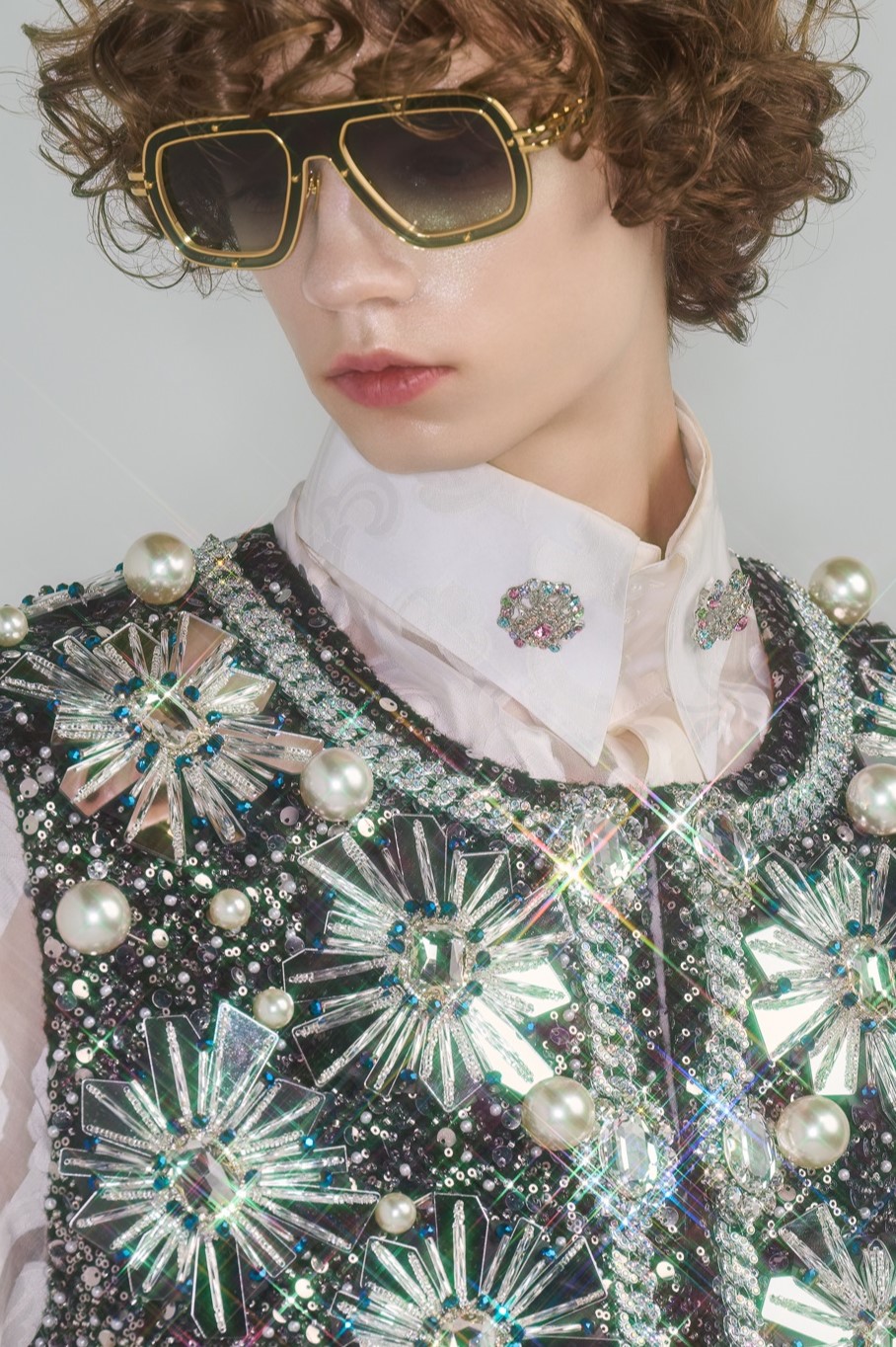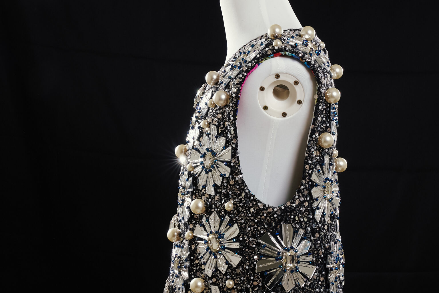 The sleeveless silhouette accentuates authority, while the surface — covered in radiating crystal motifs — evokes stars forged in motion. It celebrates the harmony between grandeur and restraint, capturing the aura of eternal sovereignty.