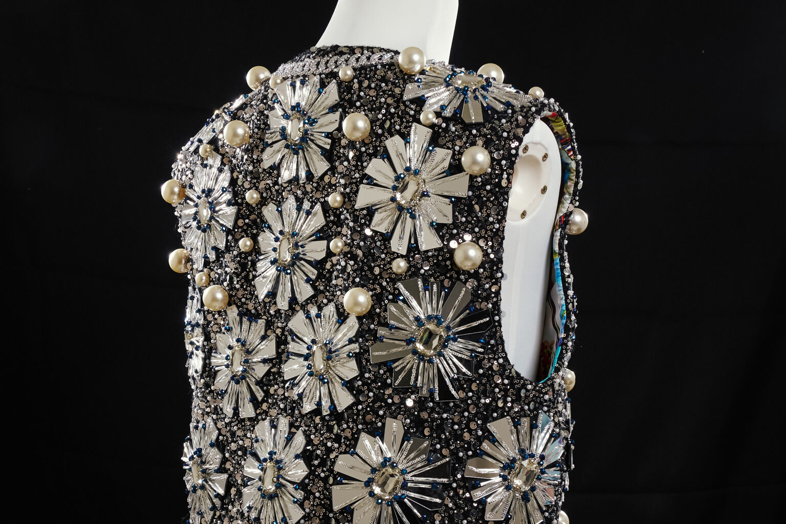 Constructed from black sequin fabric, the vest is densely hand-embellished with mirrored silver petals, pearls, and jeweled centers forming symmetrical starbursts. Each gem reflects light like celestial rays, creating a rhythmic pattern across the garment.