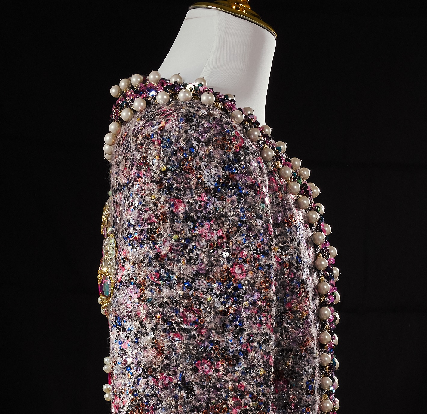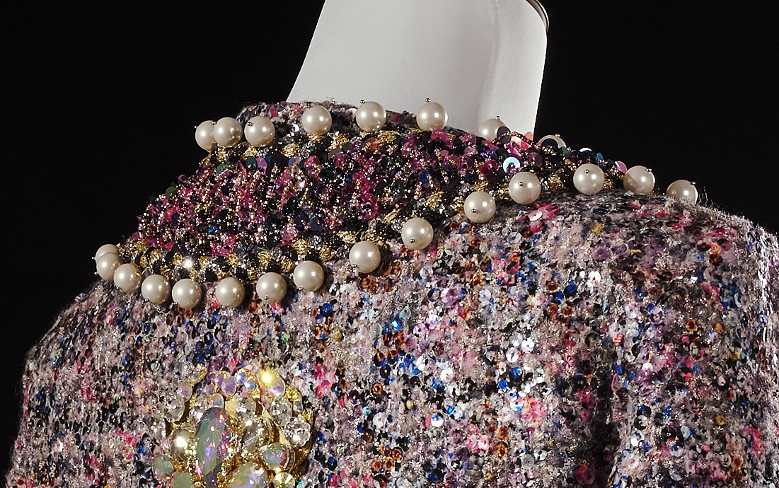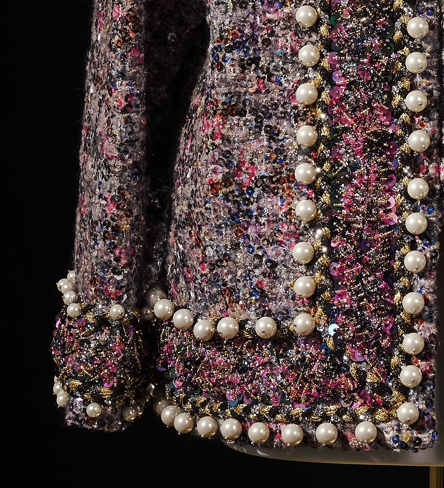 The jacket is constructed on a structured tweed foundation to support the weight of dense embellishment. Each pearl border is individually hand-stitched to ensure consistent spacing and durability.