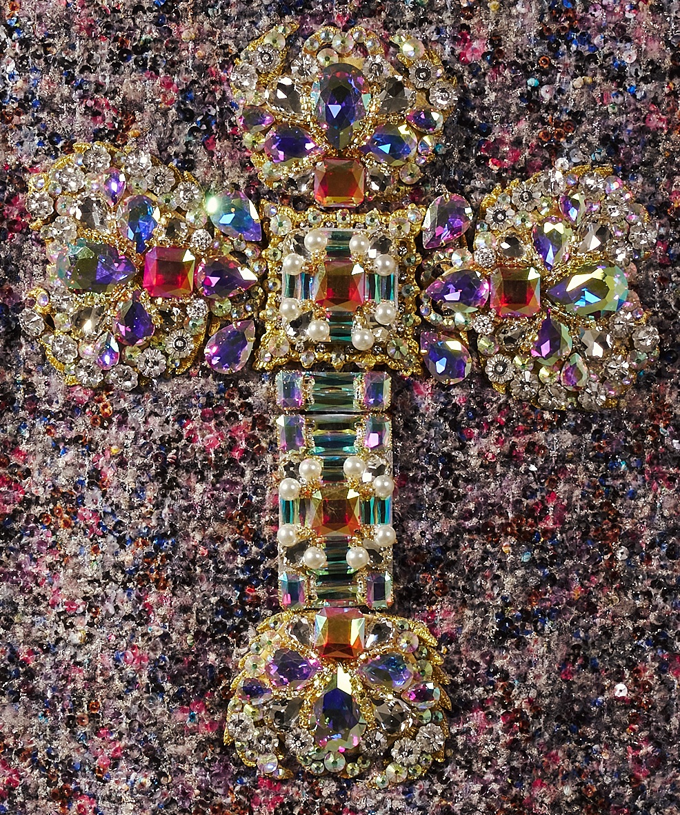 At the back, an opulent jeweled cross emerges as the spiritual centerpiece. Composed of iridescent crystals, faceted gemstones, and gold-toned settings, the motif captures shifting hues of blush, amber, violet, and soft aurora light. Each stone is layered to create sculptural depth, transforming the garment into a wearable reliquary.