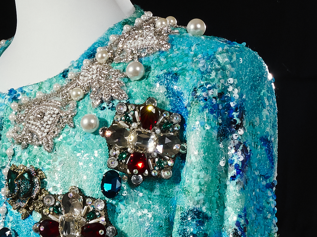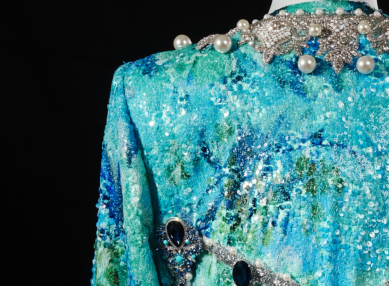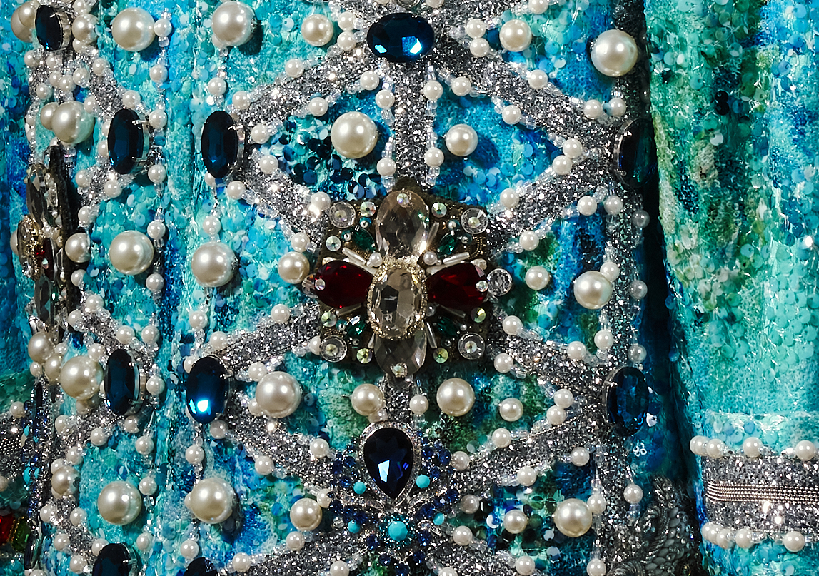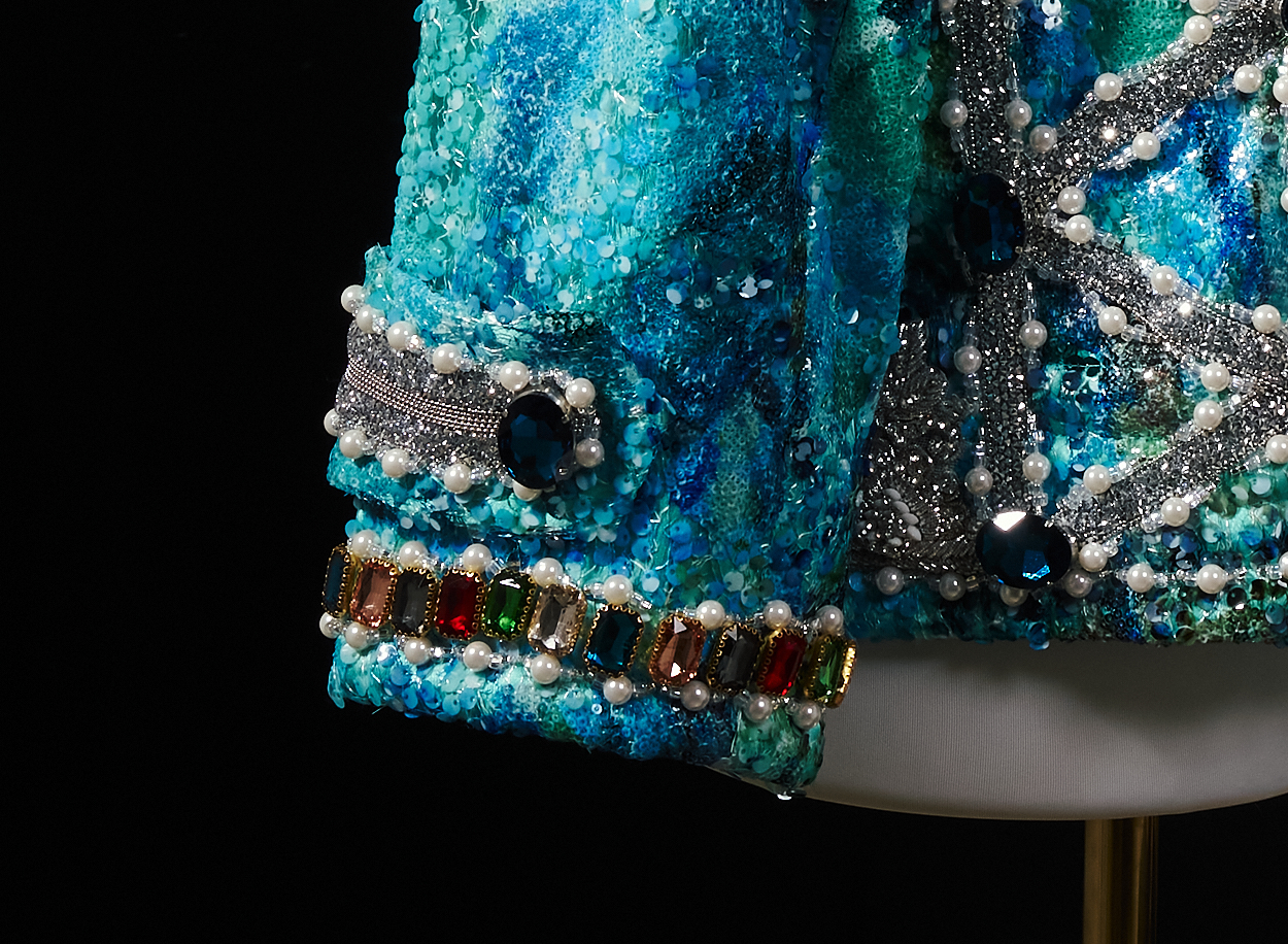 Crystals, pearls, and metallic beads are hand-applied across the garment, forming structured lines that contrast with the fluidity of the fabric beneath.